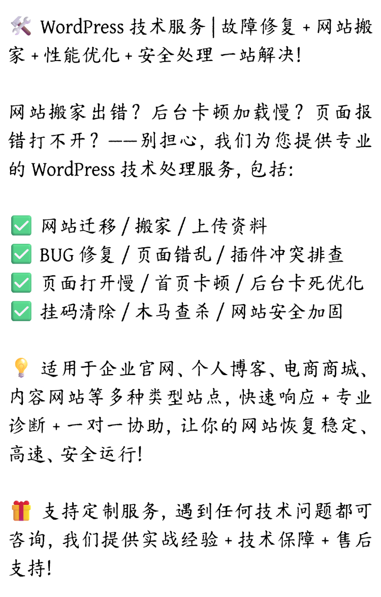 网站技术服务wp网站迁移搬家上传资料wp处理bug修复优化
